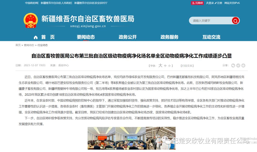 2023年12月,自治區(qū)畜牧獸醫(yī)局第三批自治區(qū)級(jí)動(dòng)物疫病凈化場(chǎng)名單公布,巴楚公司第二羊場(chǎng)獲此殊榮。三年多來,在農(nóng)業(yè)農(nóng)村部、中國動(dòng)物疫病預(yù)防控制中心的指導(dǎo)下,巴楚安欣通過采取加強(qiáng)組織管理、爭(zhēng)取政策支持、抓好技術(shù)培訓(xùn)等有效舉措,公司養(yǎng)殖場(chǎng)區(qū)對(duì)動(dòng)物疫病凈化工作的措施進(jìn)一步細(xì)化,出色完成動(dòng)物疫病凈化工作,提升全公司動(dòng)物疫病防控整體水平,為全區(qū)動(dòng)物疫病凈化工作積累成功經(jīng)驗(yàn)。安欣牧業(yè)必將不斷提高宣傳培訓(xùn)的實(shí)效性,穩(wěn)步推進(jìn)全區(qū)動(dòng)物疫病凈化工作,為全區(qū)畜物業(yè)高質(zhì)量發(fā)展提供有力支撐。