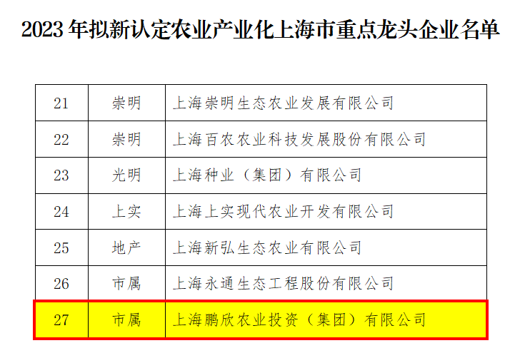 12月12日,上海市農業(yè)農村委員會公示了2023年農業(yè)產業(yè)化上海市重點龍頭企業(yè)名單,鵬欣農業(yè)投資集團被認定為農業(yè)產業(yè)化上海市重點龍頭企業(yè)。